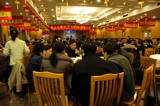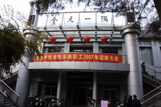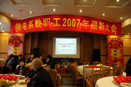 1月26日晚,在学校食天一隅,信电系200多名教职员工,喜聚一堂,共同欢度07年新年的到来。在会场大门口,一幅大型横幅标语赫然悬挂在上方,在老远的地方就能给人们感受到新年的气氛,迎新会别开生面,主会场以我系在06年问世的小宝宝们照片为背景,小宝宝们个个动人可爱,意喻我们信电系即将跨入一个新的历史起点。离退休教工早早地就来到会场就座,老同志们相互问候,共贺新春的到来。