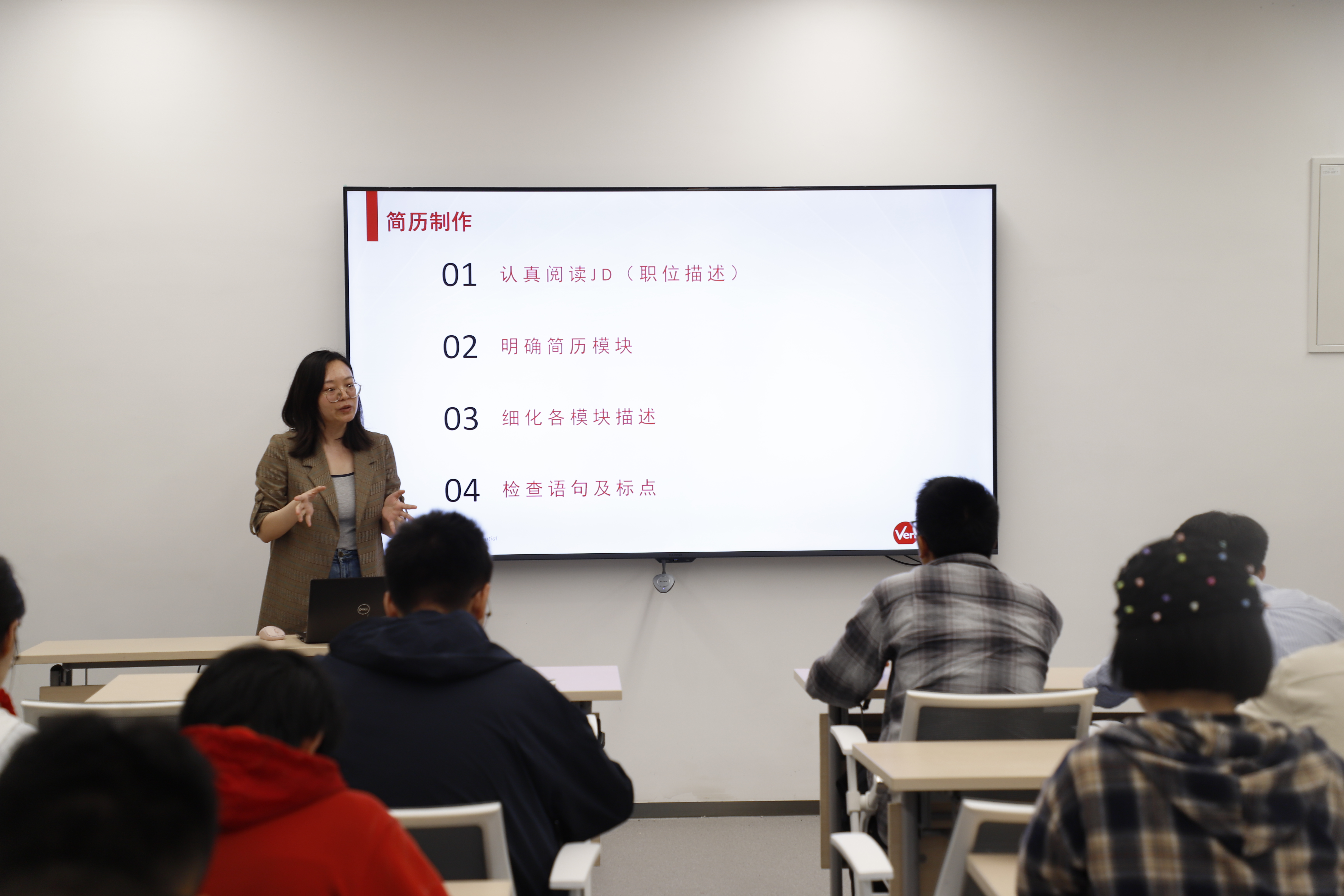 在“简历制作” 环节,主讲人给出了清晰的“四步法”:首先应仔细阅读职位描述,准确把握岗位要求和关键词,为简历内容确定方向;其次根据需求合理规划简历模块,如教育背景、工作经历、项目经验等,突出与岗位相关的部分;然后各模块内容需具体细化,强调成果与能力,避免空泛叙述;最终检查语句表达与标题设置,确保简洁有力、逻辑清晰,使整体简历精准高效,突出个人与岗位的高度匹配,量化成果,避免大而空的形容词;同时注意排版一致性和错误检查。