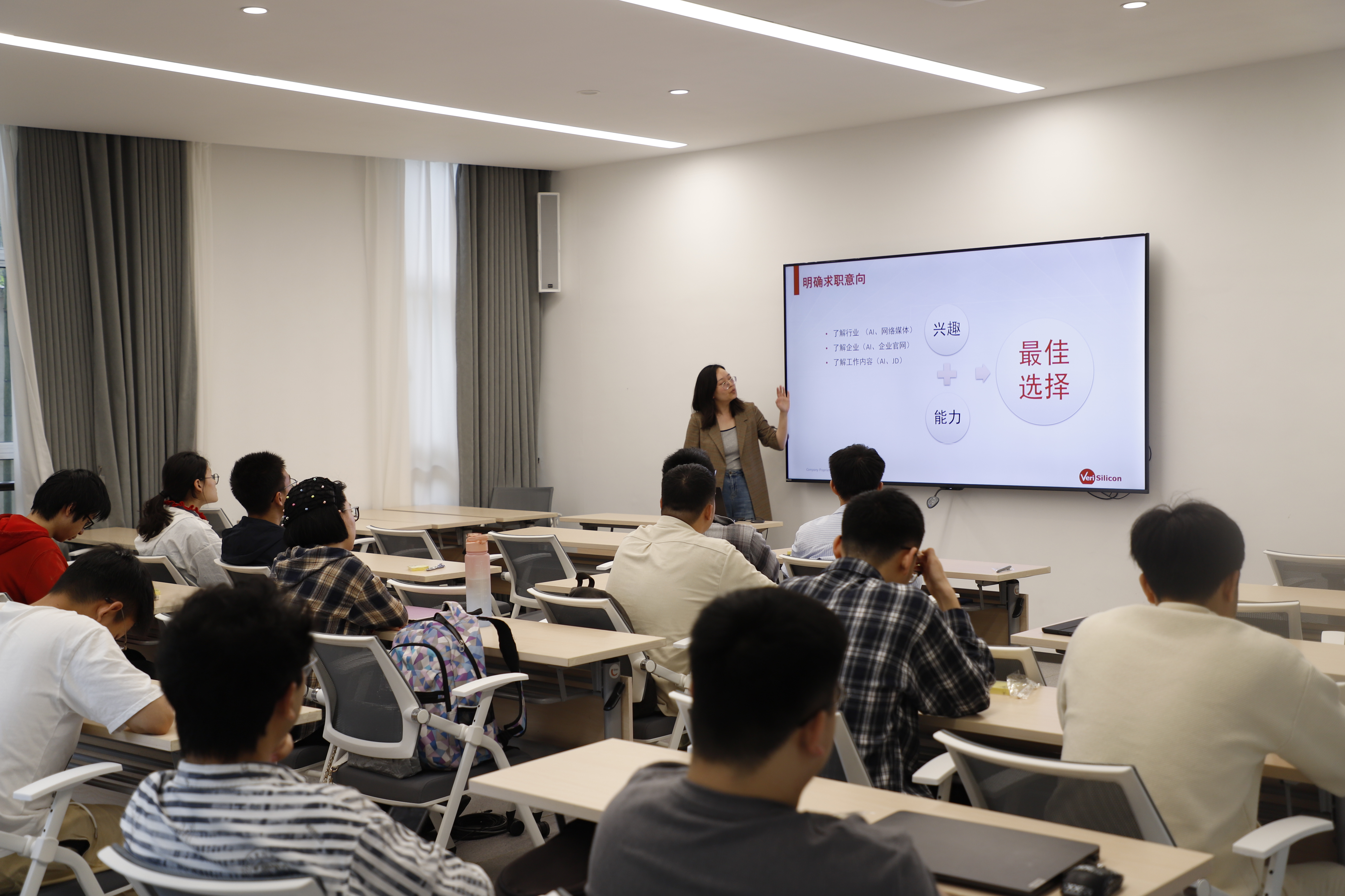 针对求职方向选择,PPT 中醒目的公式:“兴趣 + 能力 = 最佳选择”赢得了在座学生的共鸣。讲师鼓励大家充分评估个人兴趣与专业优势,锁定目标赛道,再投入深耕。