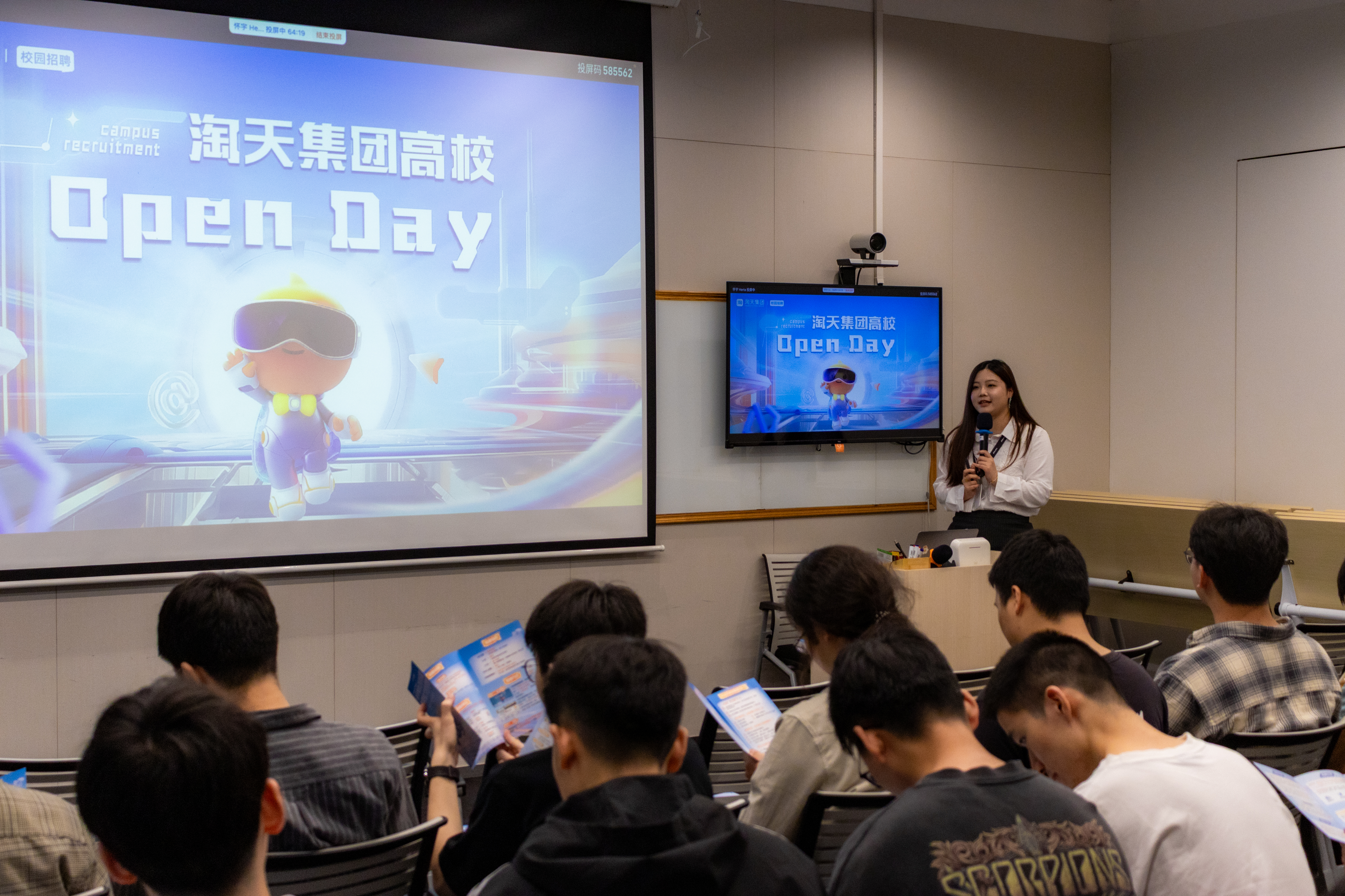随后,在招聘信息分享环节中,淘天集团校招组成员刘怀宇老师围绕公司的人才战略、岗位设置与招聘流程进行了系统介绍,并重点介绍了技术类岗位对复合型、创新型人才的需求。她指出,淘天集团高度重视青年人才的成长与发展,持续推动多元化人才引进机制,鼓励具备技术实力、协作精神和持续学习能力的高校毕业生加入企业发展进程。相在交流过程中,同学们积极与企业人员互动,深入了解行业对人才需求指向,为学生个人成长规划提供更多现实意义参考。