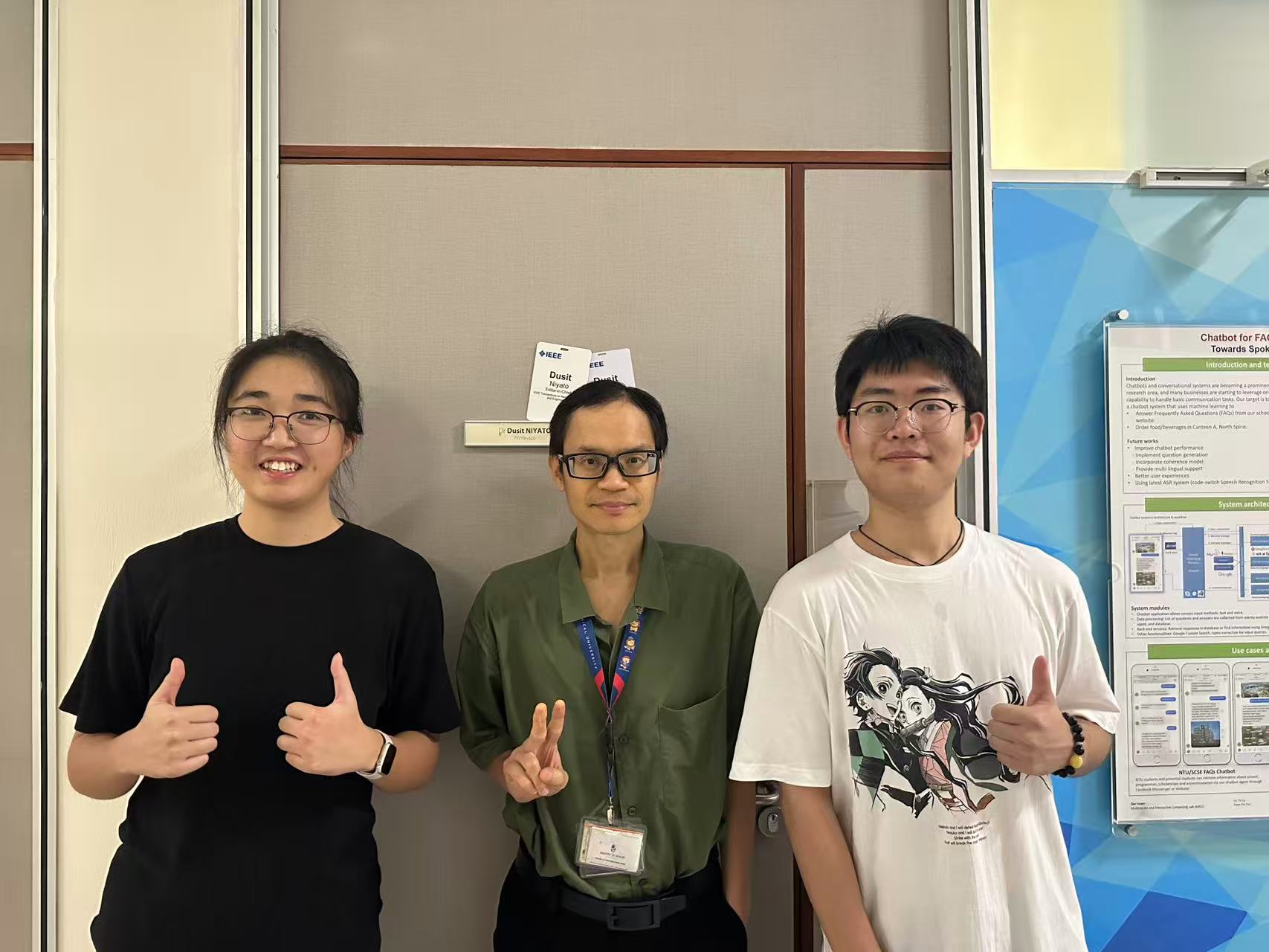 整个研究过程充满了宝贵的交流与思想碰撞。我们定期与指导教授 Dusit Niyato 深入探讨课题,每一次交流都像一场头脑风暴,不仅为我们的研究指明了方向,更启发了我们将前沿技术与 Agentic AI 框架深度融合的新思路。在项目顺利推进的节点,我们还开心地与教授合影留念,定格下了这段宝贵的师生情谊。此外,指导我们的两位学长也给予了无微不至的帮助,我们常常在轻松的餐叙中交流心得,无论是学术上的难题还是生活中的感悟,这种亦师亦友的互动让我们的研究进展事半功倍,也让身在异乡的我们倍感温暖。