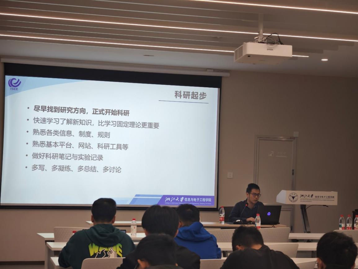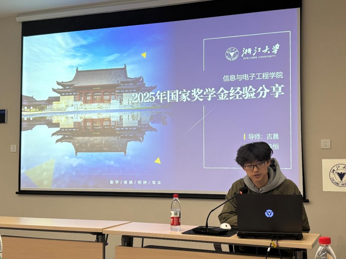 2025年11月12日下午14时,由浙江大学信息与电子工程学院主办的“I·SEE学术沙龙——国奖经验分享会”在玉泉校区高分子楼A201会议室成功举行。本次活动以“信电强院,担当有我”为主题,聚焦国家奖学金获得者的成长路径与科研心得,旨在发挥榜样引领作用,营造积极向上的学术氛围,助力研究生群体明晰发展方向、提升科研素养。
