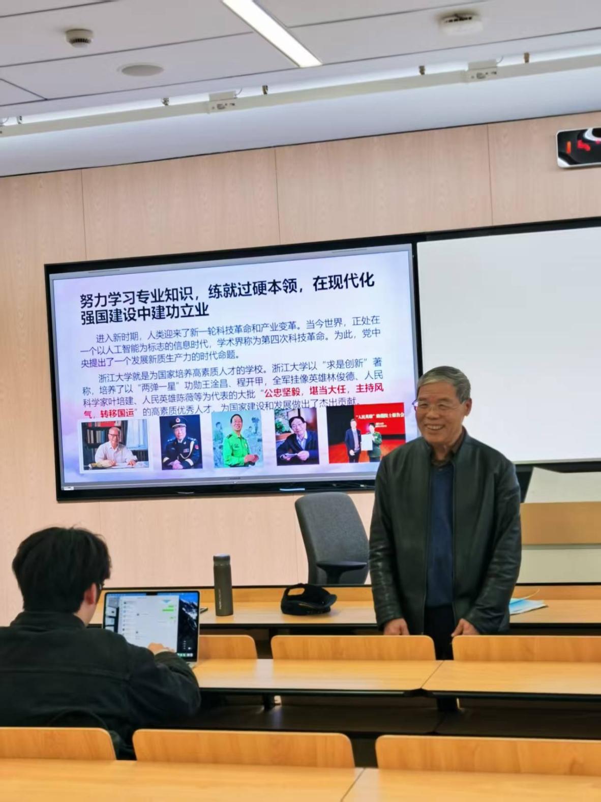 最后,李老师希望我们努力学习专业知识,练就过硬本领,在现代化强国建中。李老师通过列举浙江大学历史上的高素质优秀人才,如“两弹一星”功勋王淦昌、程开甲,全军挂像英雄林俊德、人民科学家叶培建、人民英雄陈薇,告诉我们要注重培养的深厚的爱国情怀,高尚的思想品质和敬业精神,扎实的科学理论基础和勇攀科技高峰的创新精神,以及过硬的实践能力。