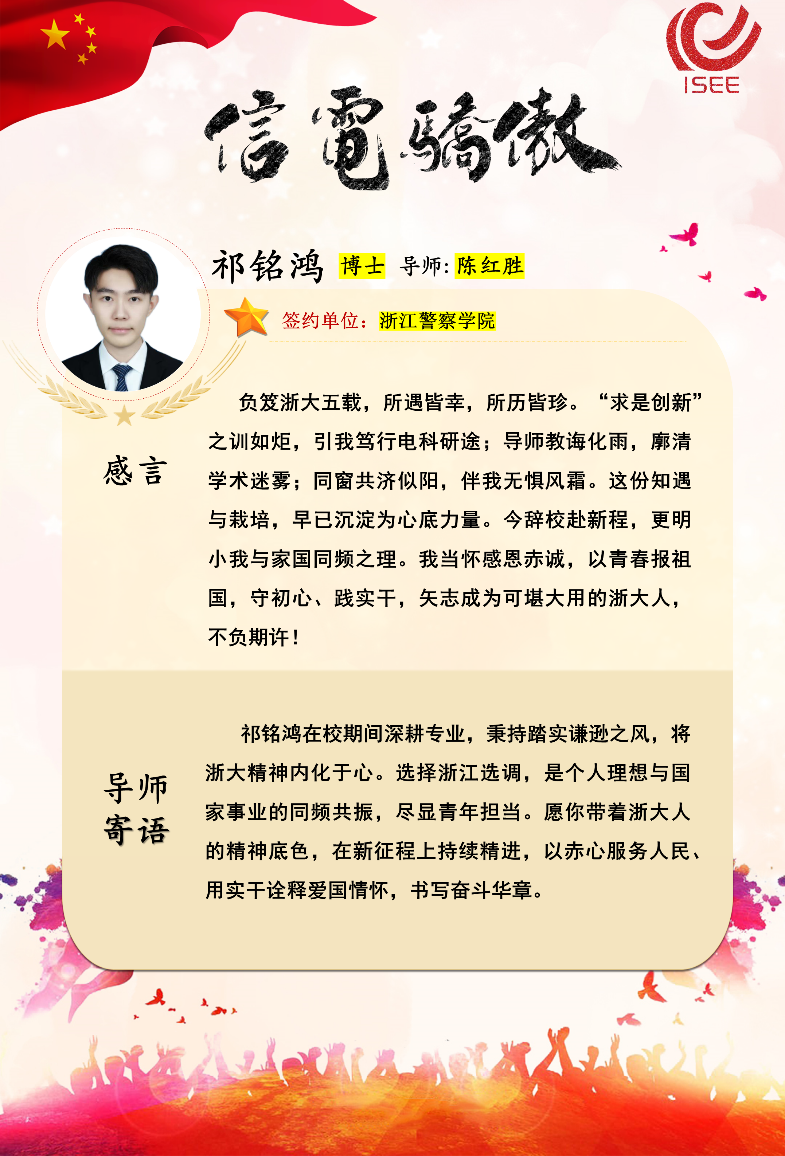 从校园走向浙江选调岗位,祁铭鸿始终怀揣服务人民、报效国家的赤子之心。他深知,新岗位不仅是扎根教育一线、贡献青春力量的舞台,更是将科研素养转化为公安事业实效、助力平安浙江建设的契机。未来,他将传承浙大精神,深入基层、倾听民声,推动专业能力与实际需求相结合,以务实行动回应群众关切,用担当诠释新时代青年的责任与使命,在服务地方与国家发展的征程中,书写无悔的奋斗篇章。
