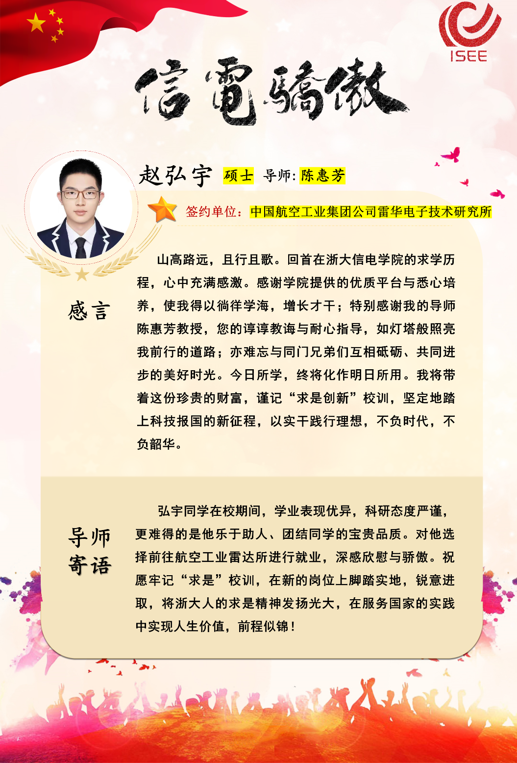 在读研期间,赵弘宇同学始终以严谨踏实的态度对待学业,在信电领域的知识海洋中孜孜以求。他不仅刻苦钻研理论知识,打下了坚实的专业基础,更勇于探索前沿,在科研实践中展现了出色的创新思维与解决问题的能力。面临人生的重要抉择,他胸怀“国家所需,即是我选”的信念,毅然选择投身于航空工业雷达所进行就业。