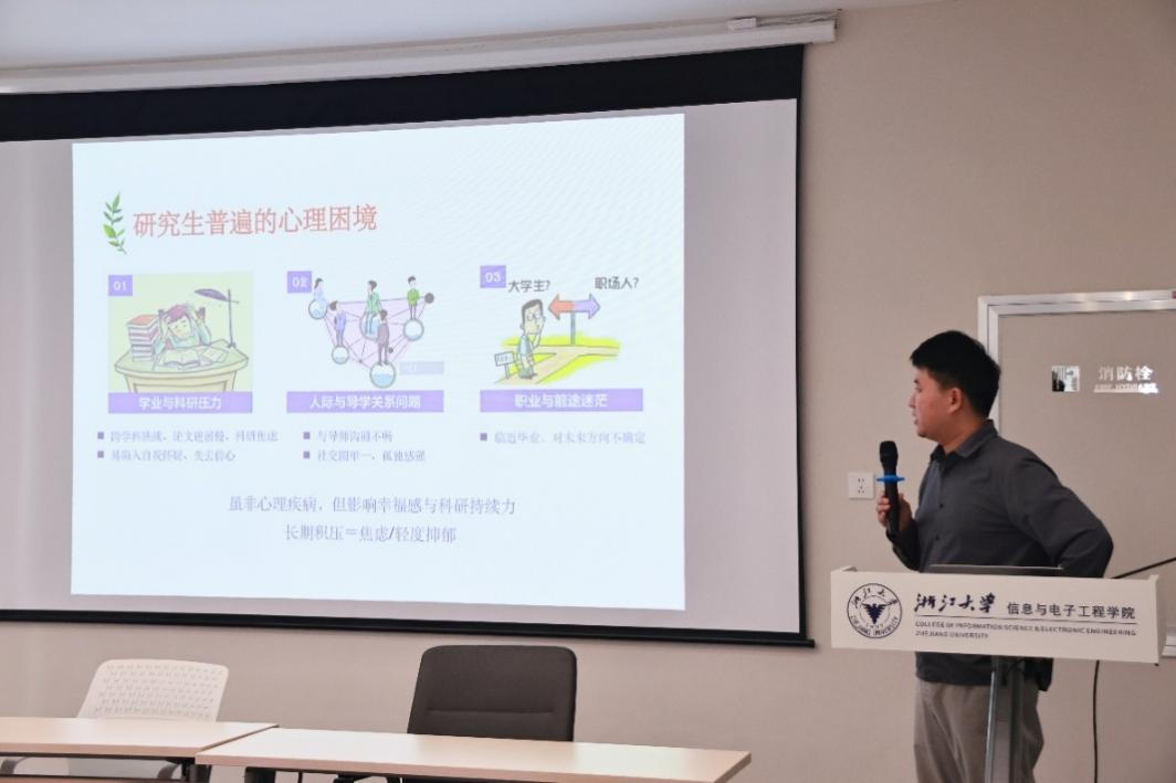 在第二阶段培训中,舒健航老师就学院评奖评优工作进行了回顾与展望。他详细解读了2025-2026学年研究生奖助工作的整体安排与关键节点,针对当前工作中存在的问题进行了深入分析,并部署了下一阶段的工作重点。此外,舒老师紧密围绕《健康中国行动(2019-2030年)》心理健康促进专项行动要求,系统介绍了浙江大学丰富的心理健康促进资源及其获取途径。他聚焦研究生群体普遍面临的学业科研压力、人际与导学关系、职业发展迷茫等现实困境,呼吁全体骨干积极发挥作用,推动校园心理促进工作走向深入,实现从“知心”到“护心”的效能升级。