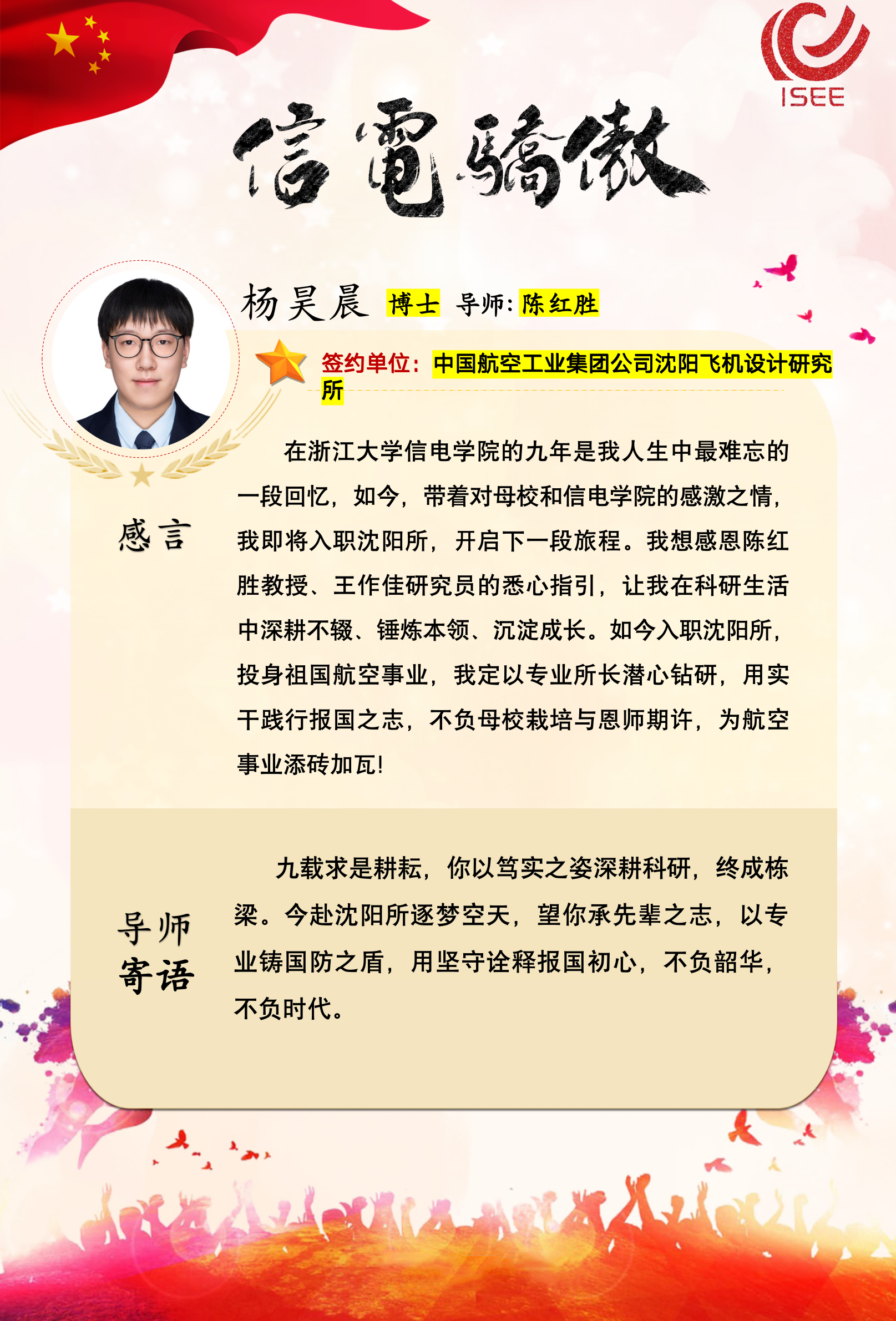 如今,杨昊晨即将入职中国航空工业集团公司沈阳飞机设计研究所,投身国防科技与航空航天事业的壮阔征程。沈阳所作为新中国首个飞机设计研究所,这里孕育了歼-8、歼-15等四十余个重点机型,传承着徐舜寿、顾诵芬等先驱的创新基因,更镌刻着罗阳“用生命托举战机”的奉献精神。入职伊始,他将博士阶段的科研积累转化为型号关键技术的研发与推进,变的是应用场景,不变的是“铁翼铸魂,以科技之力卫我中华海天’的赤诚。”老一辈航空人“干惊天动地事,做隐姓埋名人”的坚守,正是他逐梦前行的不竭动力。他将在新的岗位上脚踏实地、潜心钻研,将专业所长转化为报国之力,用务实行动诠释信电人的责任与担当,在逐梦空天的道路上不负母校培养、不负时代重托。
