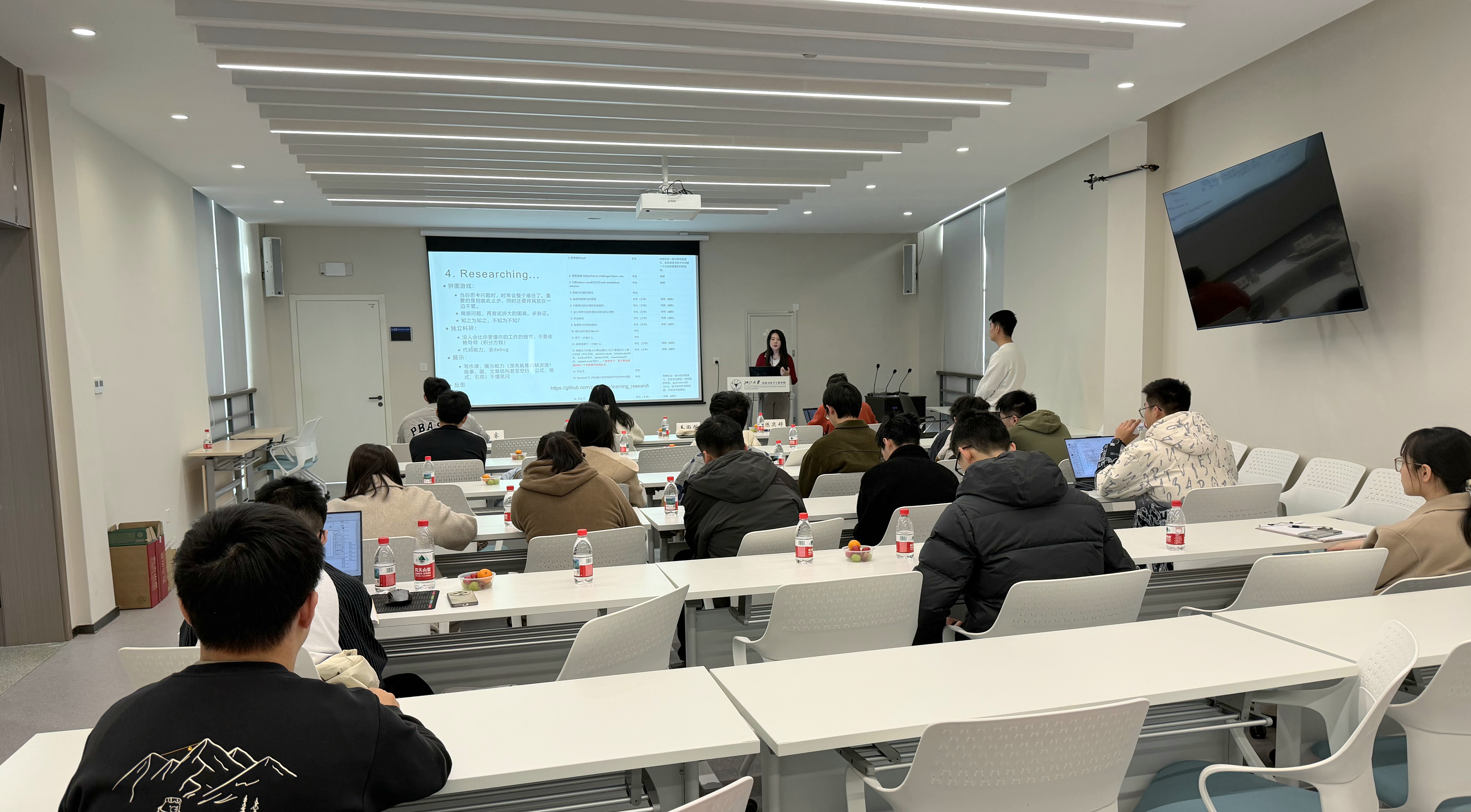 在科研经验分享环节,姜雨彤与孙凇昱两位博士生分享了她们在学术道路上的心得体会,为同学们提供了关于学术生涯规划、方法论以及心态建设的宝贵建议。姜雨彤同学围绕“PhD互勉”主题,强调了保持身心健康、培养良好学术品味(Topic Taste)以及遵守学术礼仪的重要性,勉励大家敢于挑战难题。孙凇昱同学则分享了诸多宝贵的“血泪经验教训”,着重强调了早期方法验证、目标拆解和效率管理的关键作用,并建议同学们保持张弛有度的科研节奏,平衡好工作与生活。