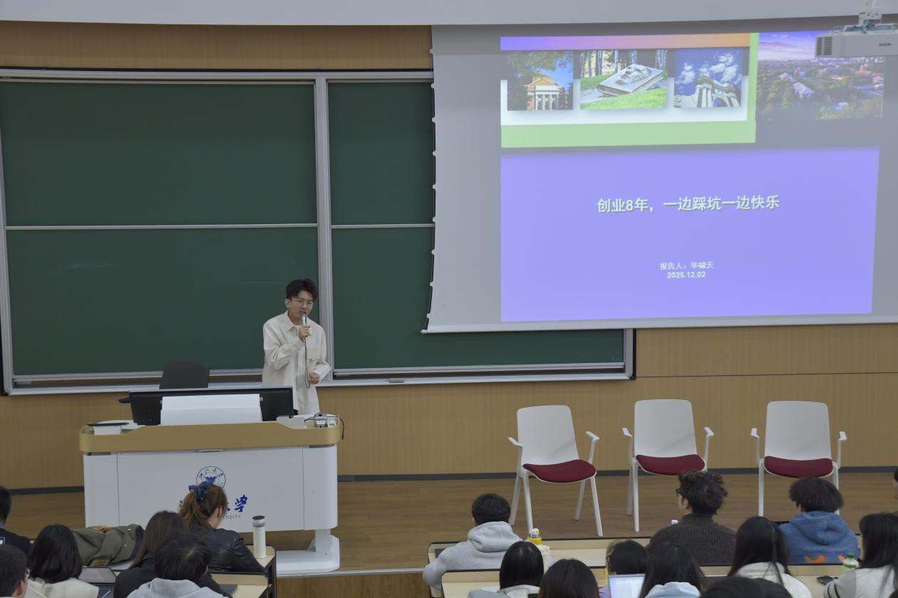 毕导以“创业八年,一边踩坑一边快乐”为题,分享了自己从科研到科普创业的跨界经历。他结合自身内容创业实践,生动阐述了管理者与被管理者的角色转换与视角差异,并提出运用“热力学与动力学”模型辅助决策——即选择那些既符合时代趋势(热力学),又与个人能力路径相匹配(动力学)的“难而正确的事”。他鼓励同学们坚持长期主义、坚守品质,方能在创新与创业的道路上行稳致远。