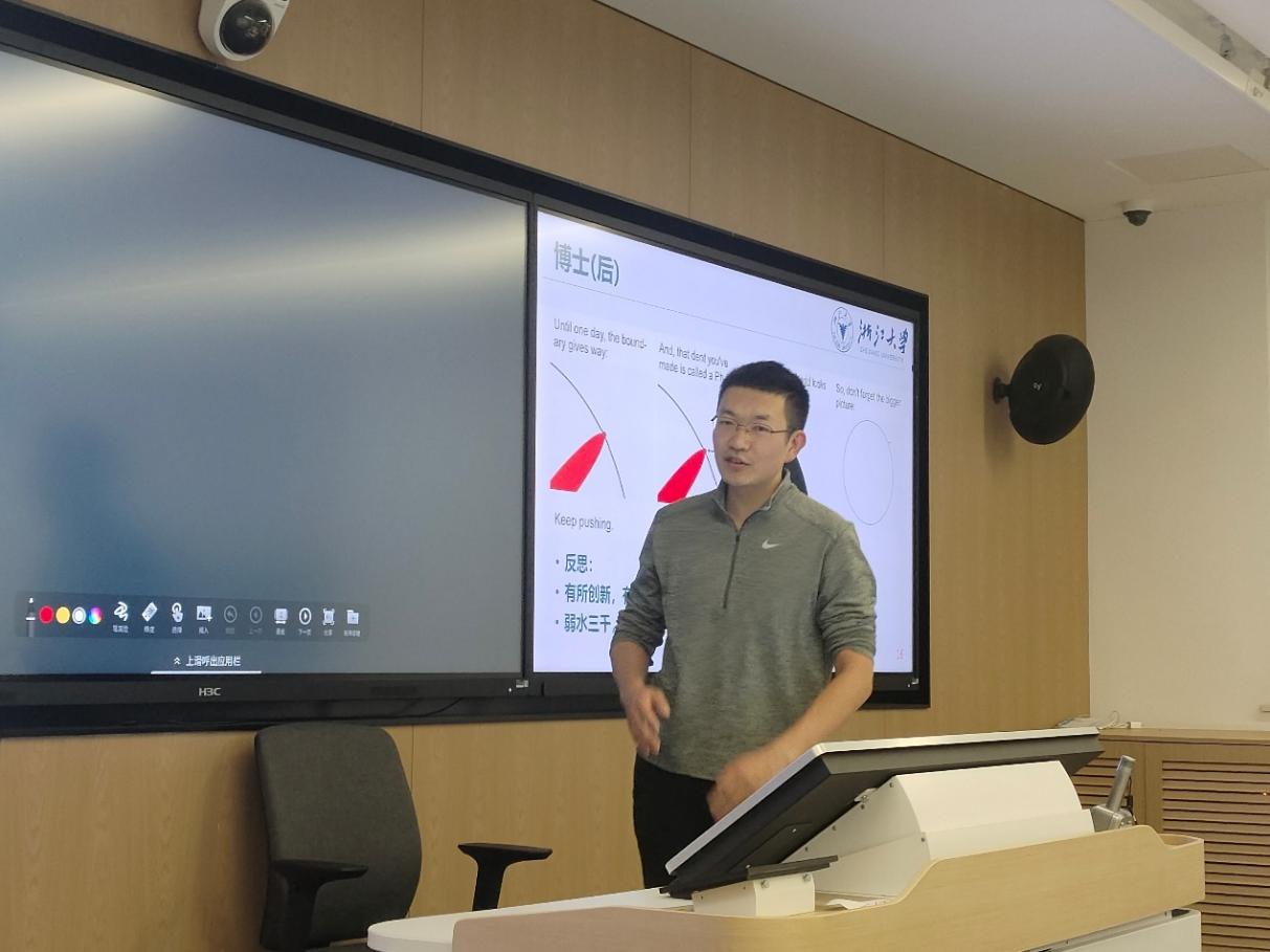 接下来,班主任李晨晖老师结合自身从本科到博士的求学历程,讲述了在科研道路上遭遇挫折时如何坚守信念、调整心态、迎难而上。同时,班主任老师借着非常出名的知识圈层成长图,为我们指出学习不仅是积累,更是向着人类未知领域的勇敢探索与推进。与此前王淦昌院士的事迹相呼应,展现了浙江大学一代代科研工作者“求是创新、勇攀高峰”的学术传承。最后班主任系统全面地为我们介绍了其科研项目及实验室工作。