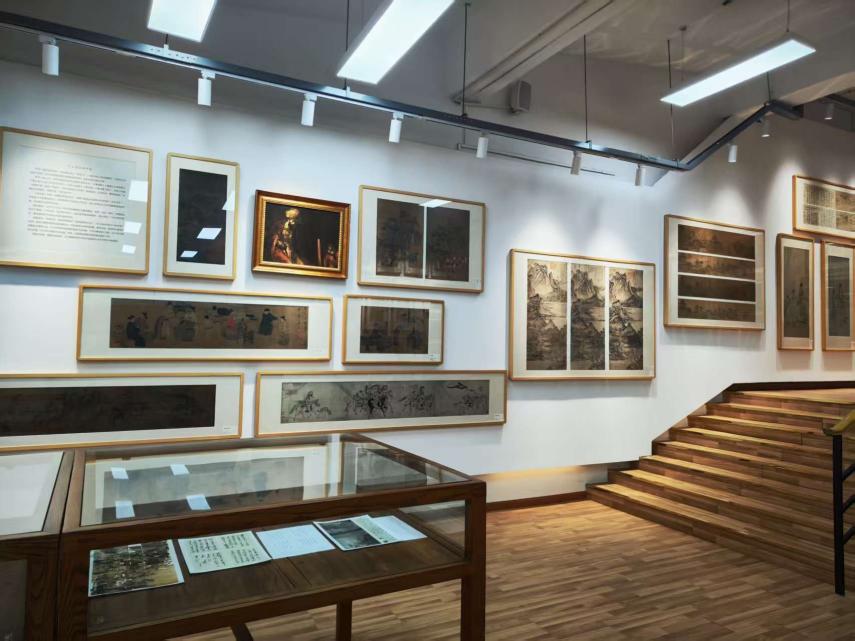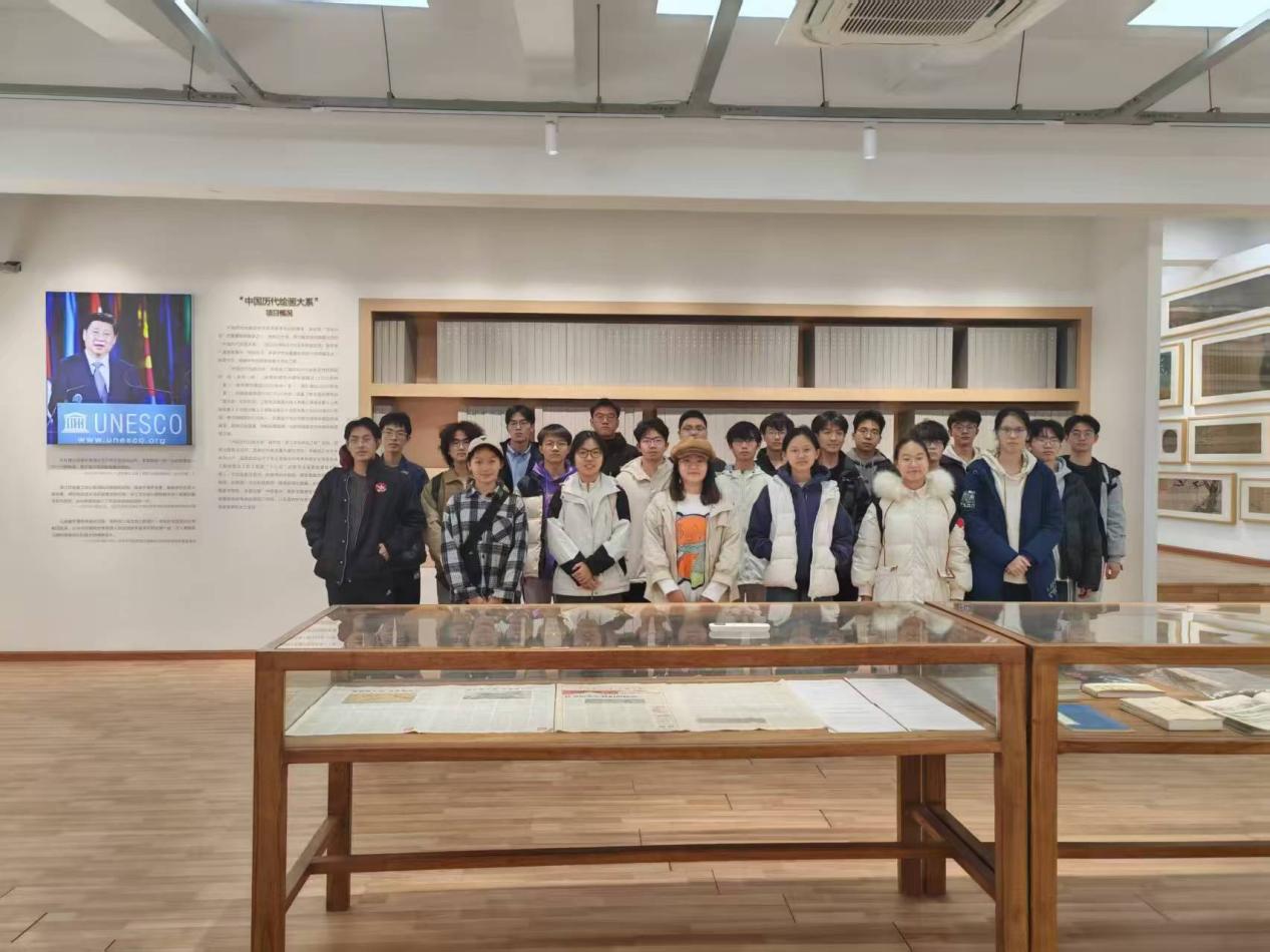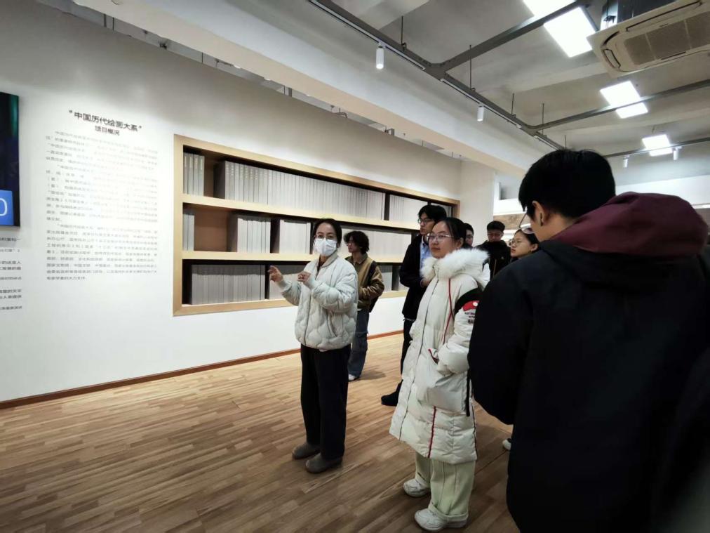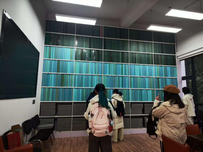 在二楼会客厅,由“大系”打板样书堆成的书墙令人震撼,直观展现了这项文化工程的厚重体量。更让同学们深受启发的是,讲师分享的藏品收集过程中的科研故事:编纂团队通过细致研究,首次发现四幅散落各地的宋画原是同一幅作品,仅因历史裁切才辗转分离。这一发现让工科同学们深刻体会到,学术研究与工程实践同样需要严谨的逻辑推理与敏锐的观察能力。参观过程中,同学们或驻足凝视书墙沉思,或围绕宋画“破镜重圆”的故事交流感悟,在光影流转的画作与充满巧思的科研发现中,既领略了中华绘画艺术的传承脉络,更收获了宝贵的科学启发。当看到现代技术对古画的修复与数字化呈现成果时,信工学子纷纷表示,要将专业所长融入文化传承,为文物保护与文化传播贡献力量。