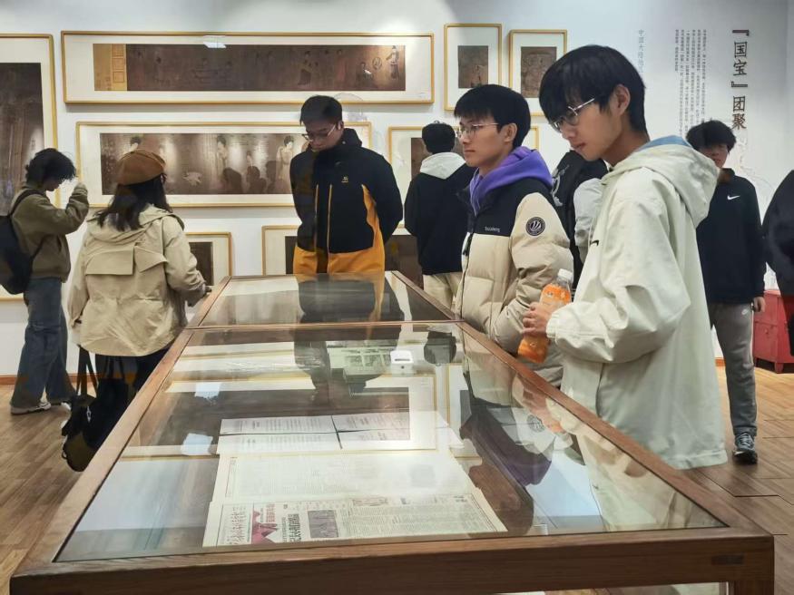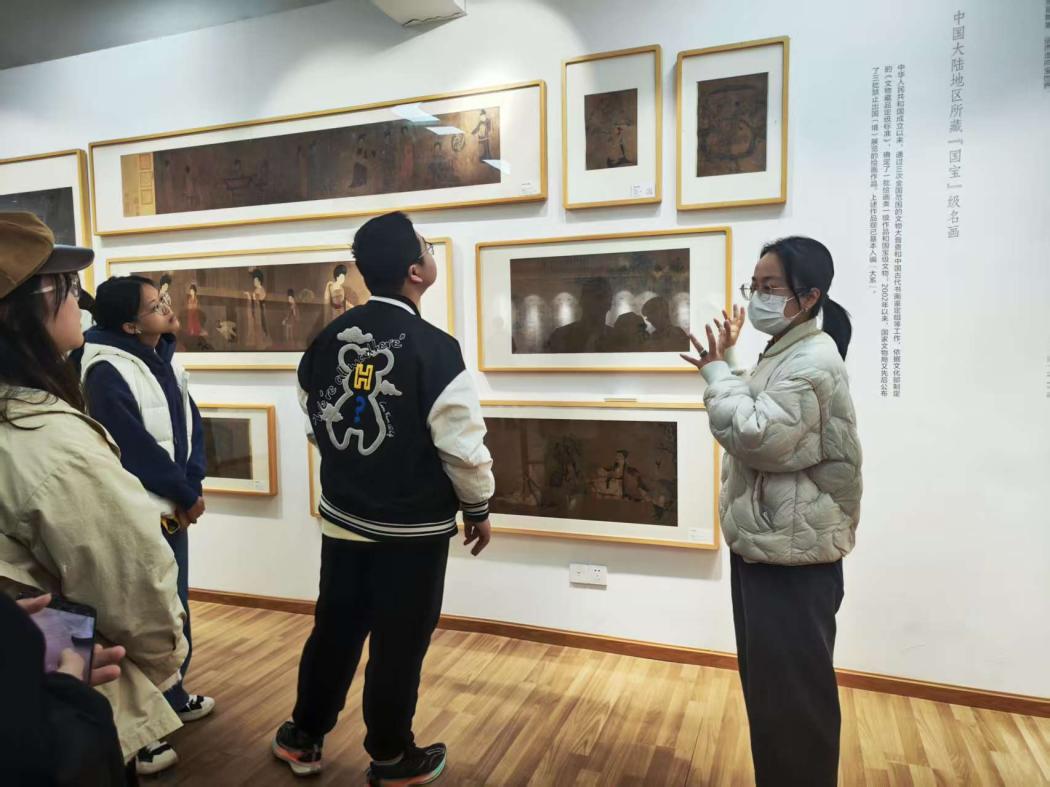 在讲解员的引导下,同学们重点驻足品鉴了《千里江山图》《五马图》等传世名作。当听到敦煌壁画复制品背后“文物归乡”的故事,了解到“大系”项目如何跨越国界收录海外藏画时,现场同学无不动容。