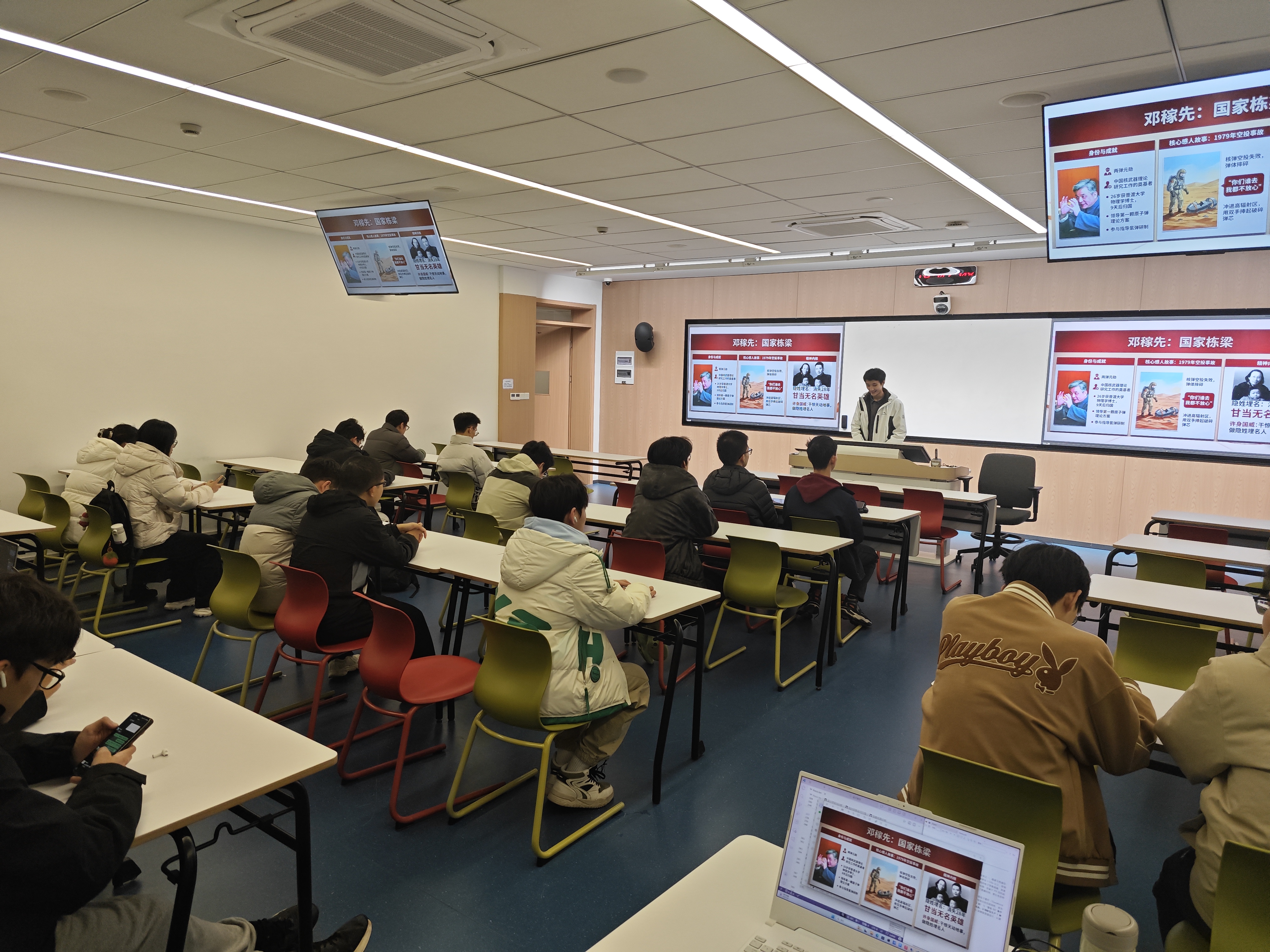 活动开篇,赵冠清同学以“两弹元勋”邓稼先院士的家国传奇为引,带领全体同学沉浸式重温了老一辈科学家的奉献史诗。他从邓稼先院士放弃海外优渥条件毅然归国的人生抉择切入,系统梳理了其隐姓埋名数十载,在荒漠戈壁中率领团队突破重重难关,成功研制原子弹、氢弹的艰辛历程。分享中,既还原了科研攻关中极端恶劣的自然环境与“从零到一”的技术瓶颈,更深度诠释了邓稼先院士“干惊天动地事,做隐姓埋名人”的崇高境界——即便身体遭受核辐射重创,仍坚守岗位直至生命最后一刻,用毕生心血践行对国家和人民的庄严承诺。真挚的讲述引发全场共鸣,让同学们深刻体悟到忠诚报国、勇攀高峰、甘于奉献的科学家精神精髓,为整场活动筑牢厚重精神根基。