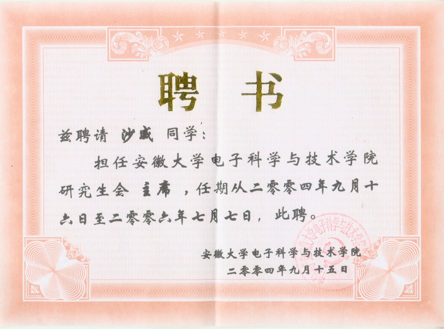 2003/09 Chairman of Graduate Union in Electronics Institute, Anhui University. (Sep. 2003—Jul. 2005 )