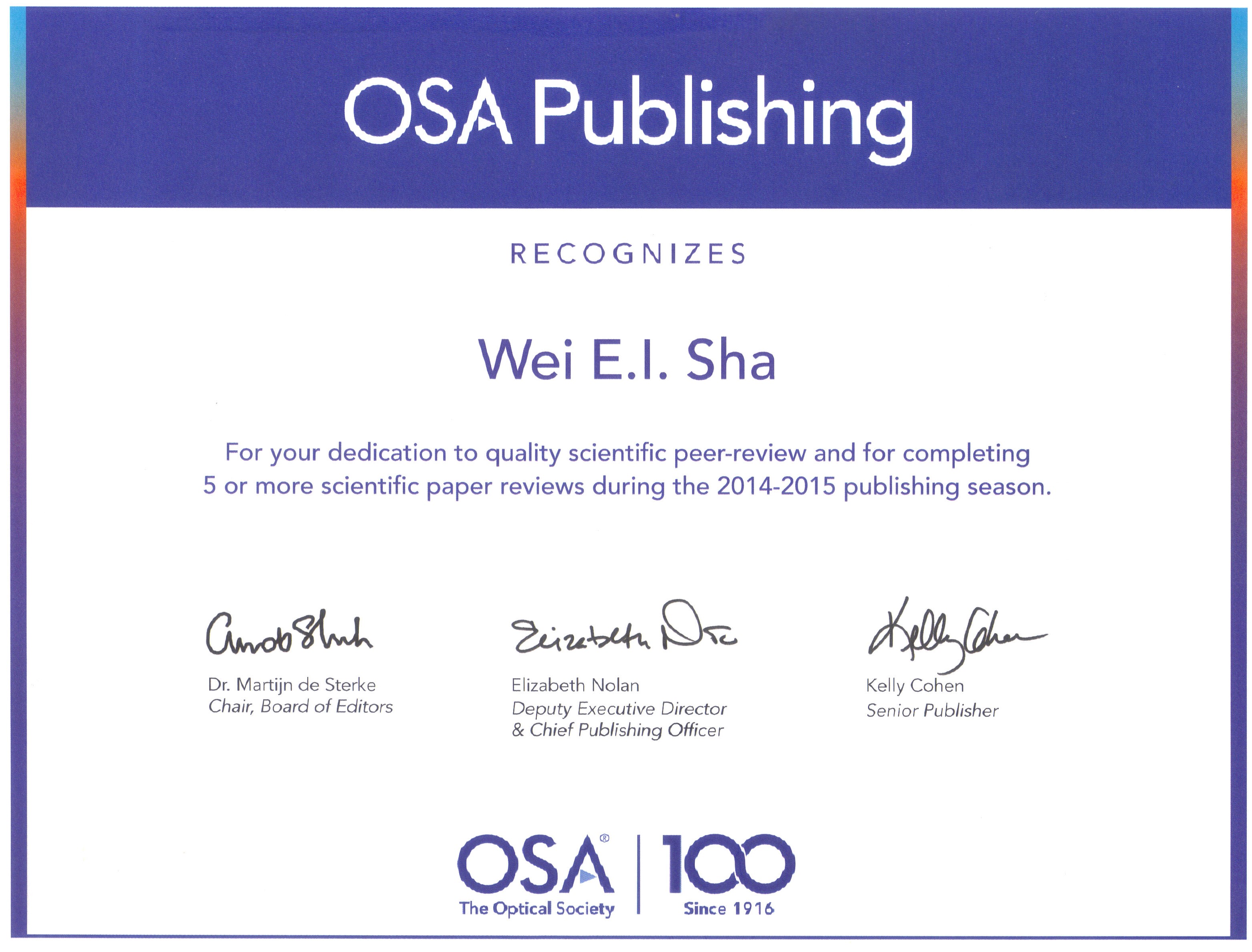 2016/05 Dedication to Quality Scientific Peer-Review for OSA Publishing.