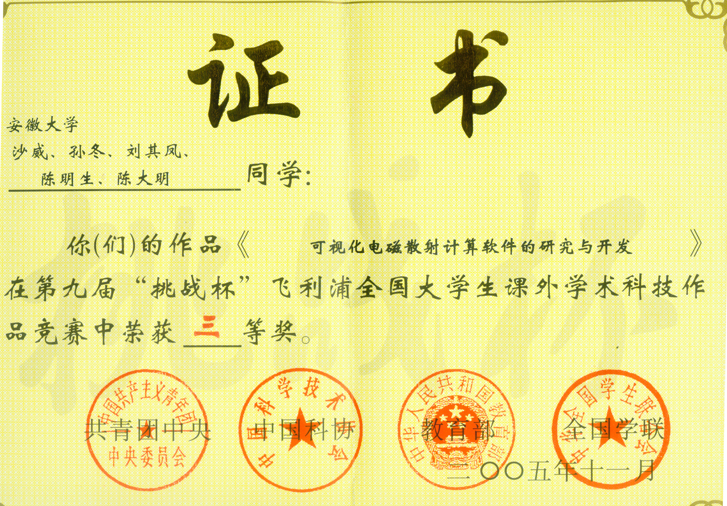 Sep. 2003—Jul. 2008 PhD degree in Electromagnetic Field and Microwave Technology, Anhui University, Hefei, China. Supervisor: Prof. Xianliang Wu (吴先良).