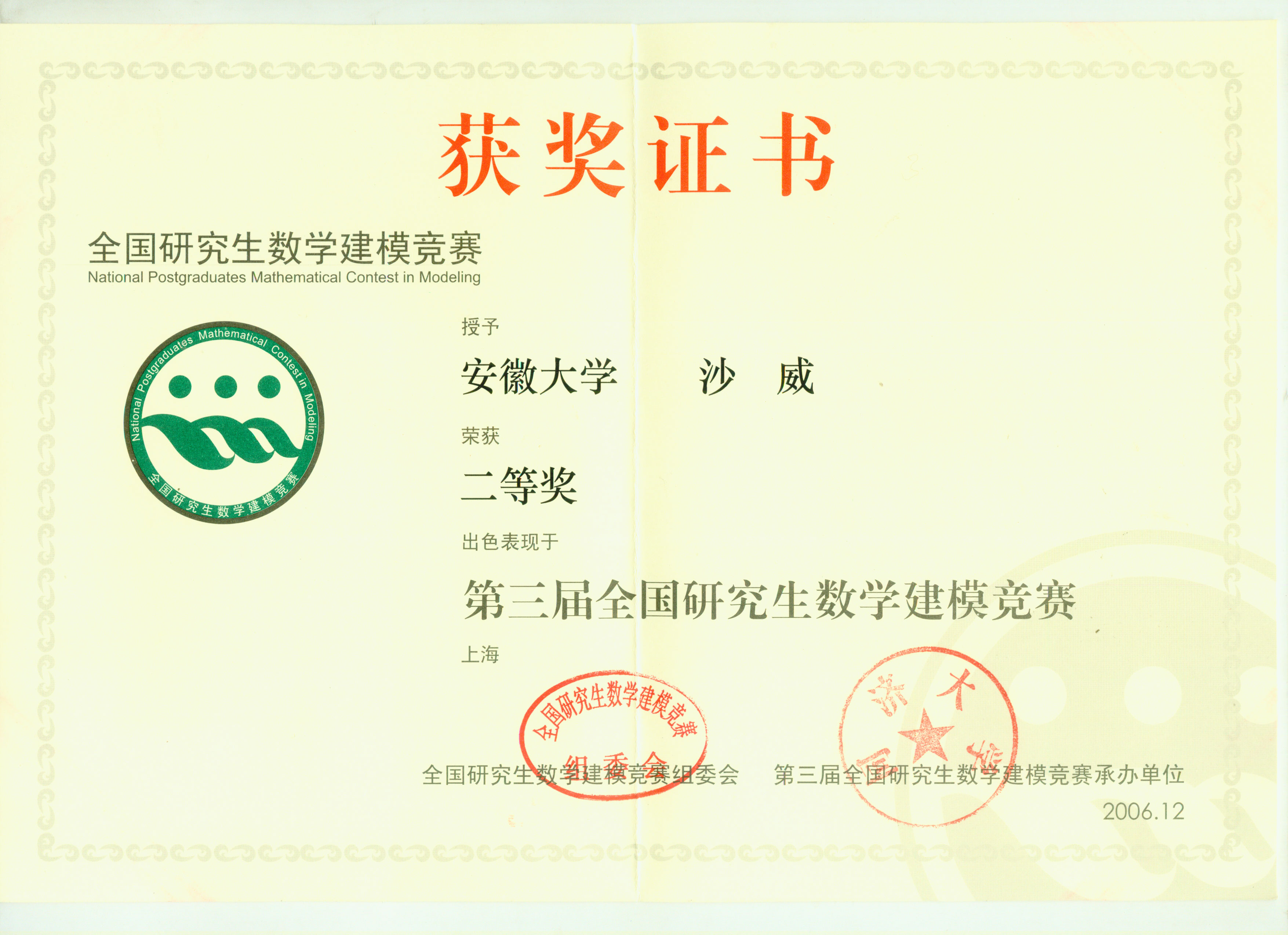 2006 Second Prize, The Third National Postgraduates Mathematical Contest in Modeling.